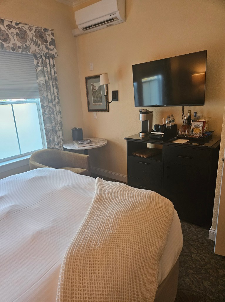 While the room was small, it was cozy and comfortable. My room did not have a view (as previously noted) as I opted for a budget friendly getaway. The amenities were plentiful and included a coffee maker, mini refrigerator (which was stocked with wine, beer and soda), a large flat screen TV, bathrobe, mini bar that included dry gin, tequila, Grey Goose vodka, and Kentucky bourbon along with a price list if I chose to imbibe. However, I brought my own wine–Butternut Chardonnay. I tend to gravitate towards wine that has the word butter in it!