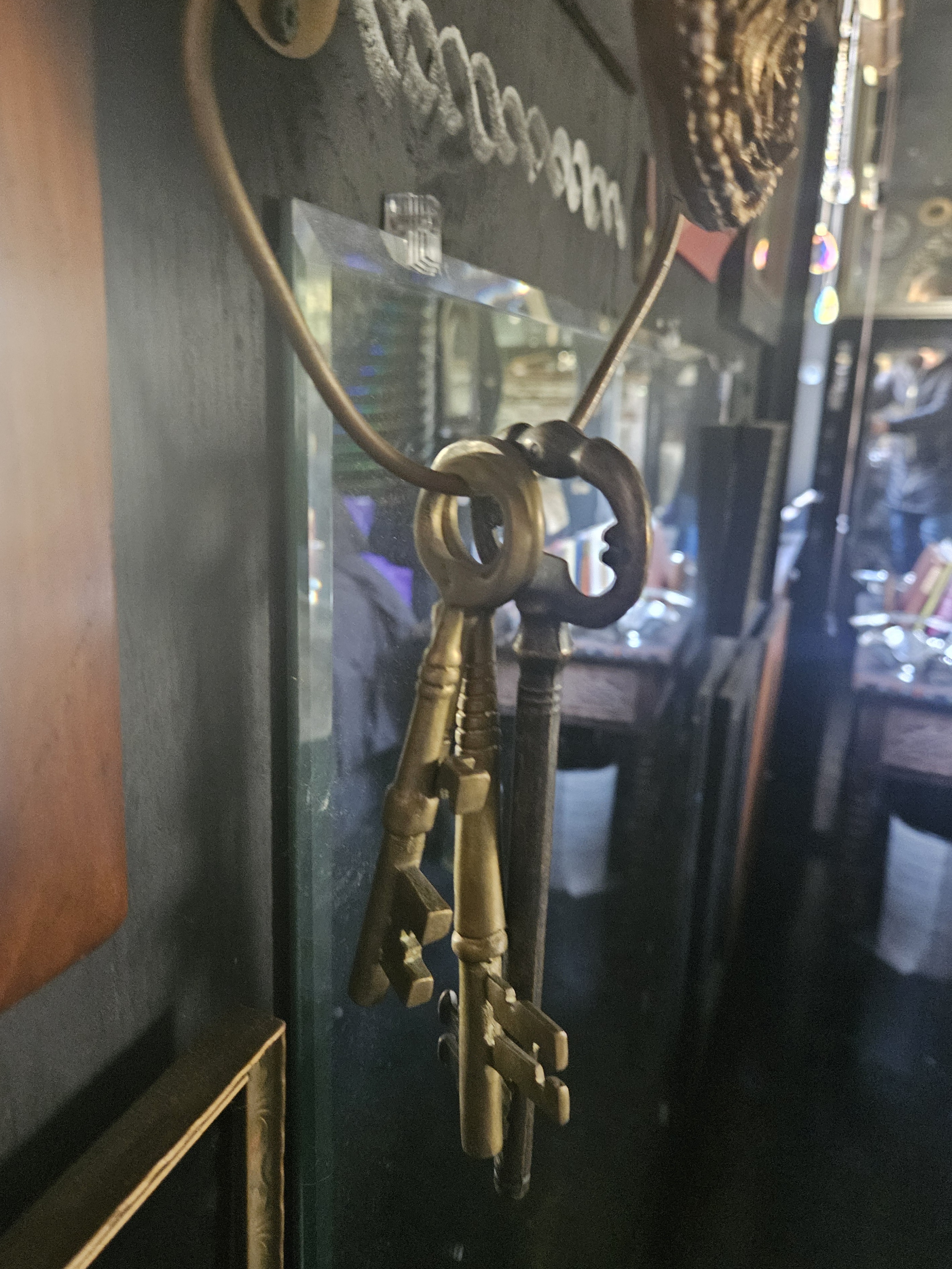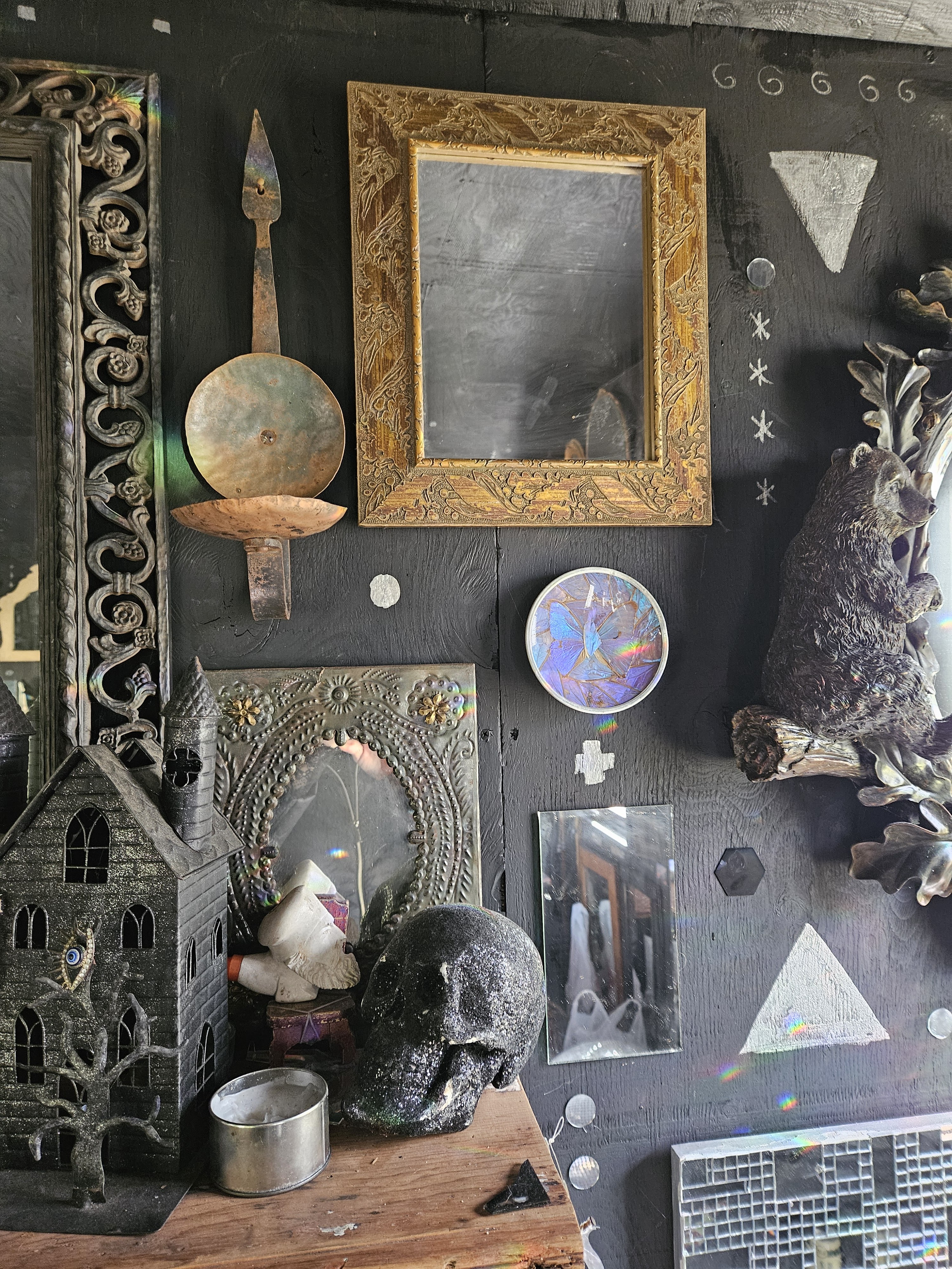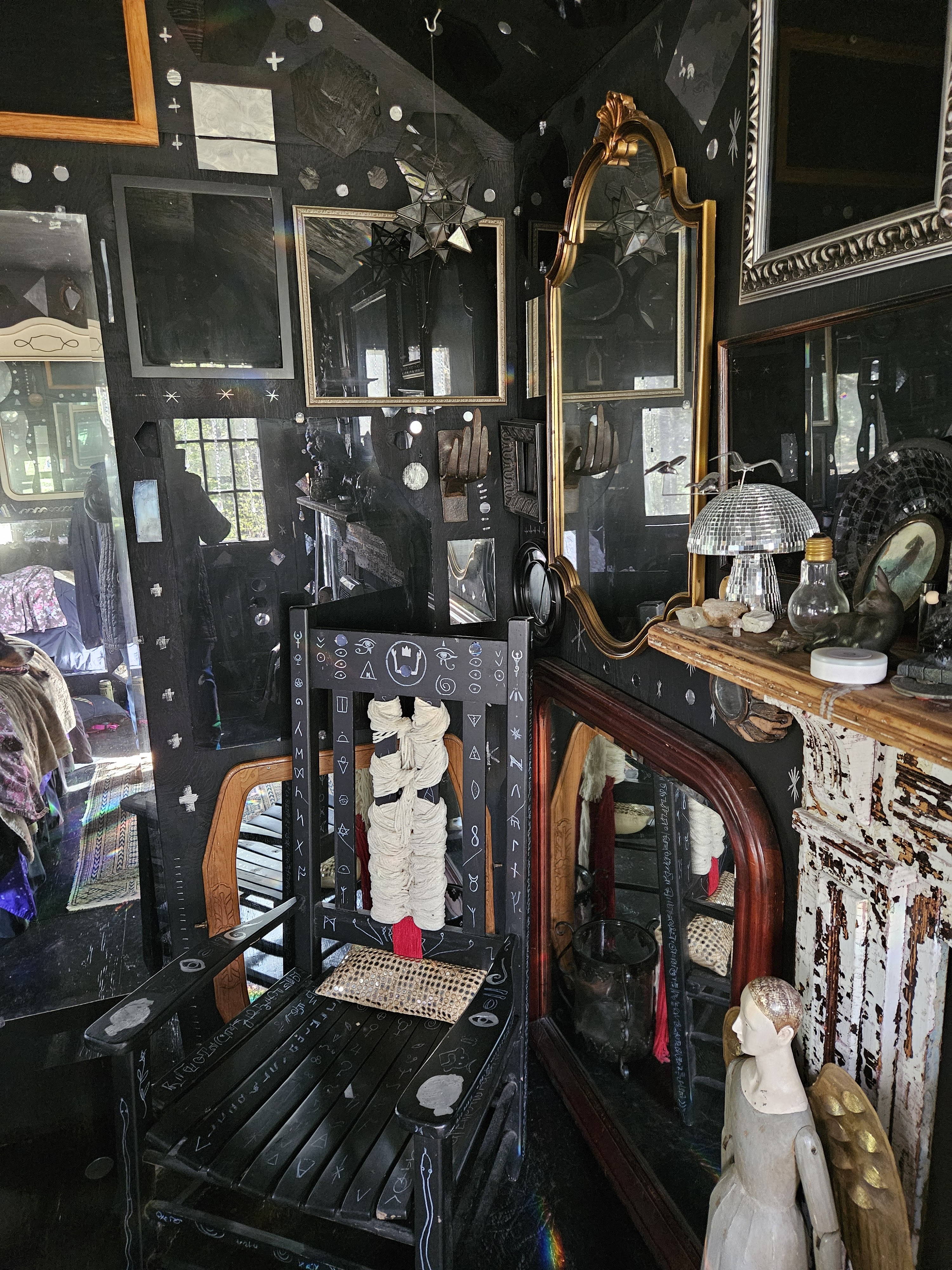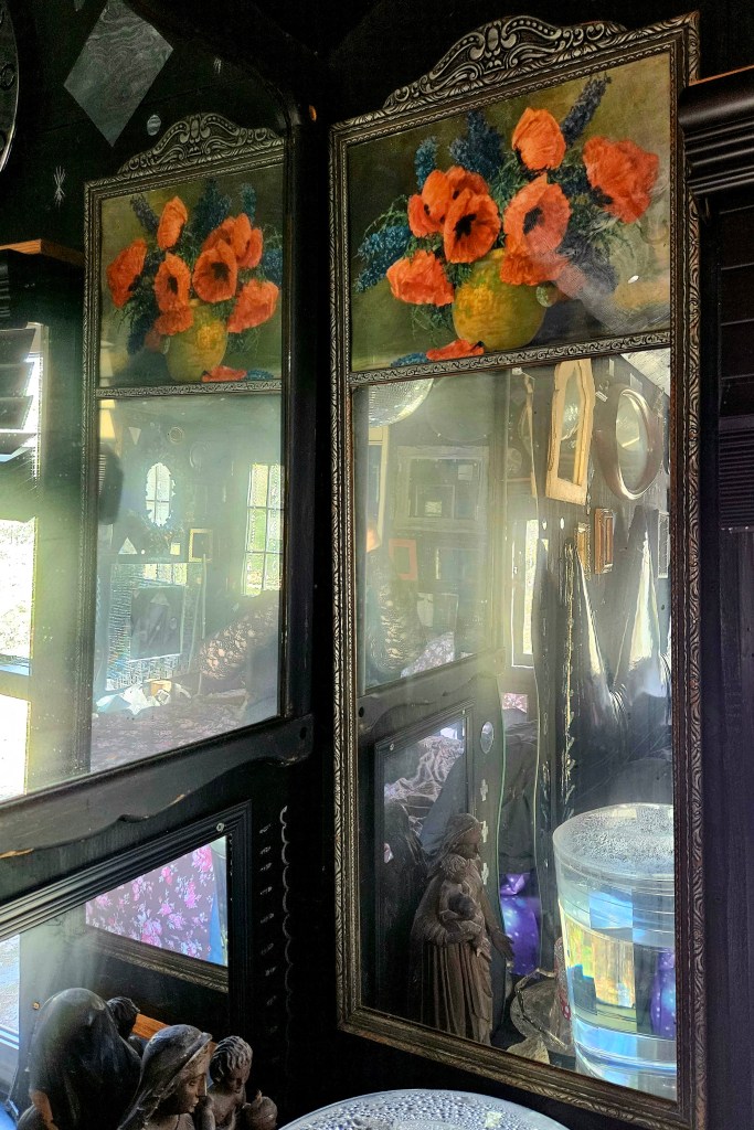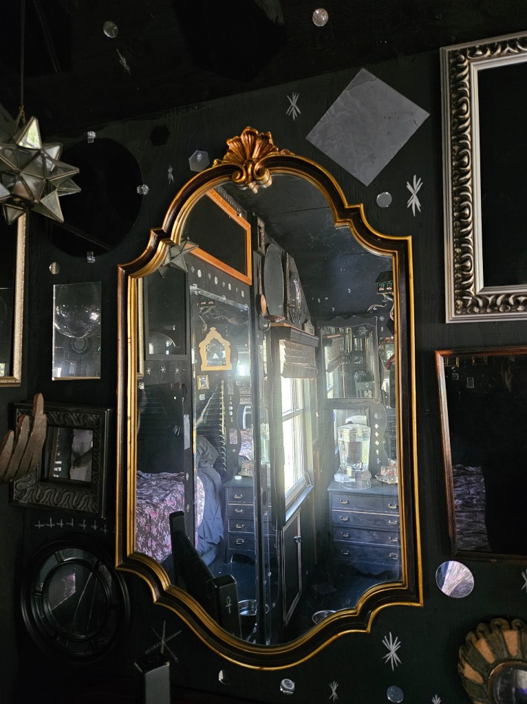 The cabin itself is very tiny but it packs a big punch with its Victorian/Gothic theme. If you’ve ever been frustrated by a rental that lacked mirrors, this place will be such a treat (ha!). There are floor-to-ceiling mirrors of different styles, sizes and time periods.